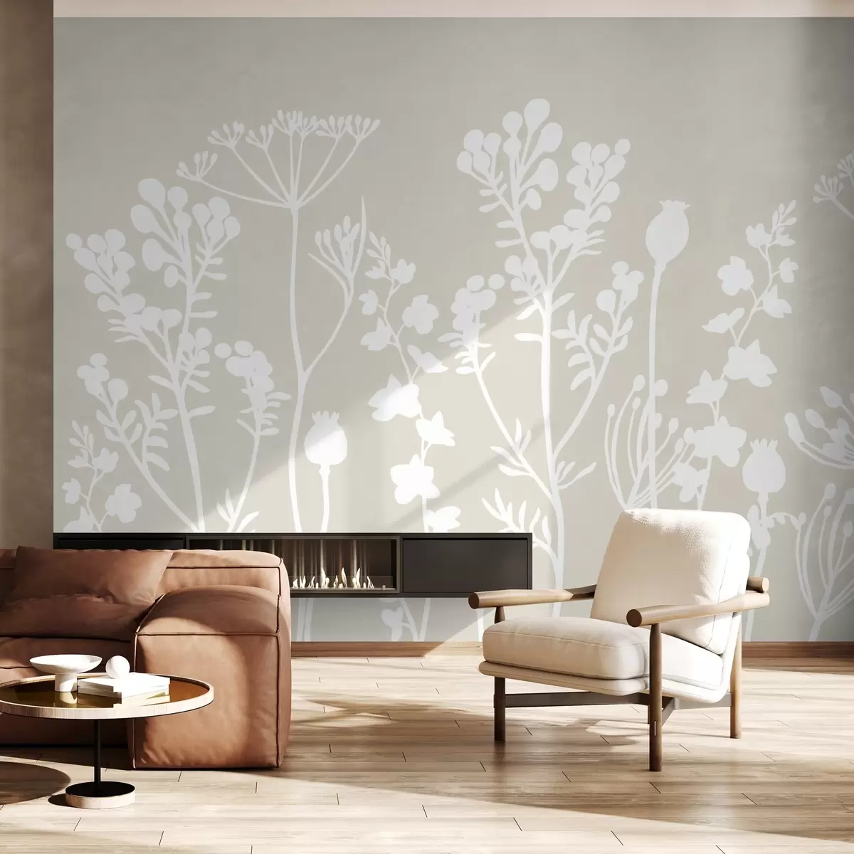 Тапете за зид беле силуете цвећа на беж позадини бр. w02809v2