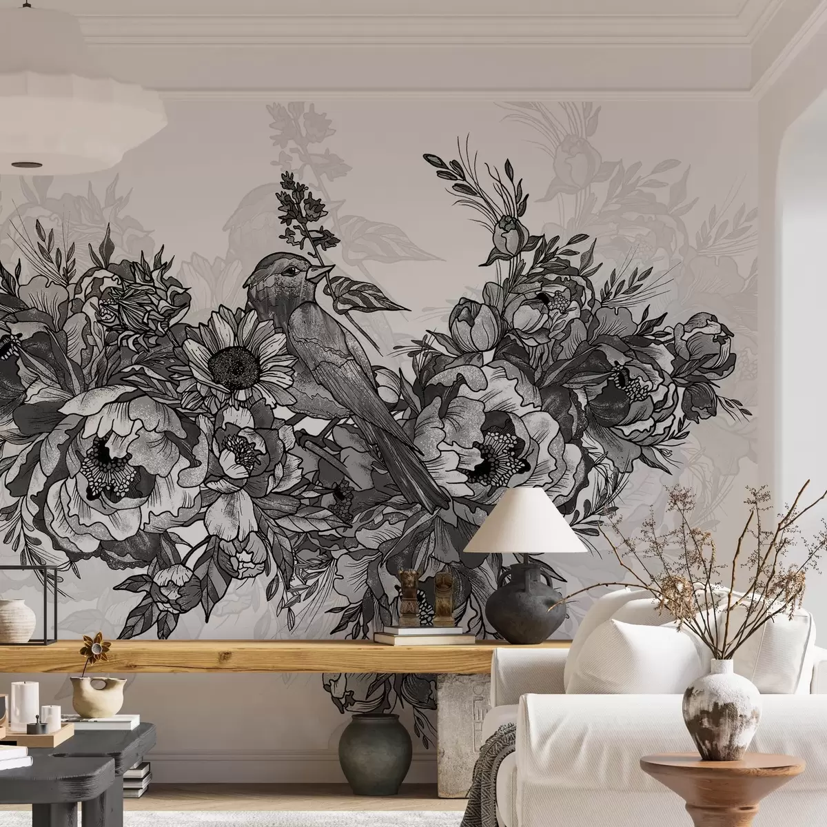 Тапете за зид Монохромна цветна и птичја композиција бр. w02834