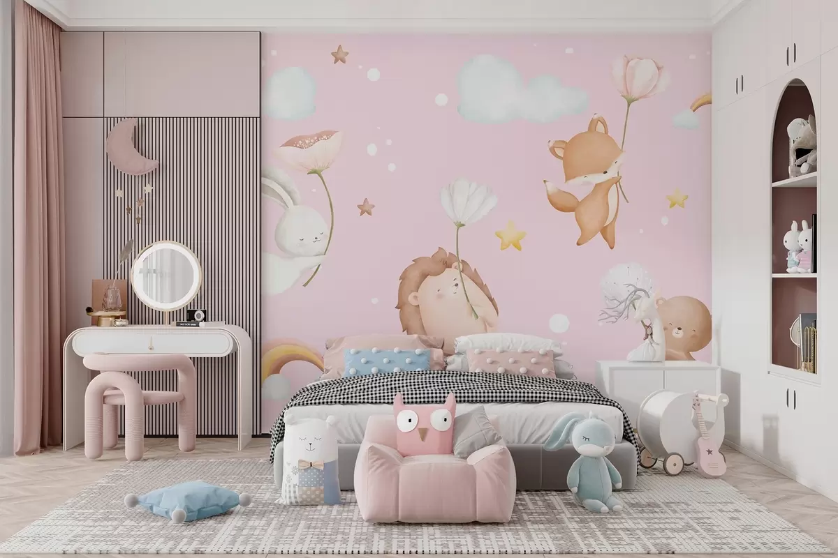 Тапете за зид Животиње са цвећем на ружичастој позадини бр. w02897