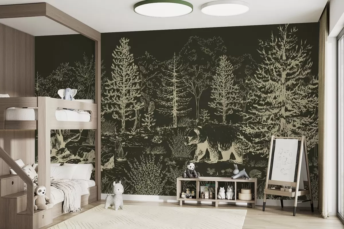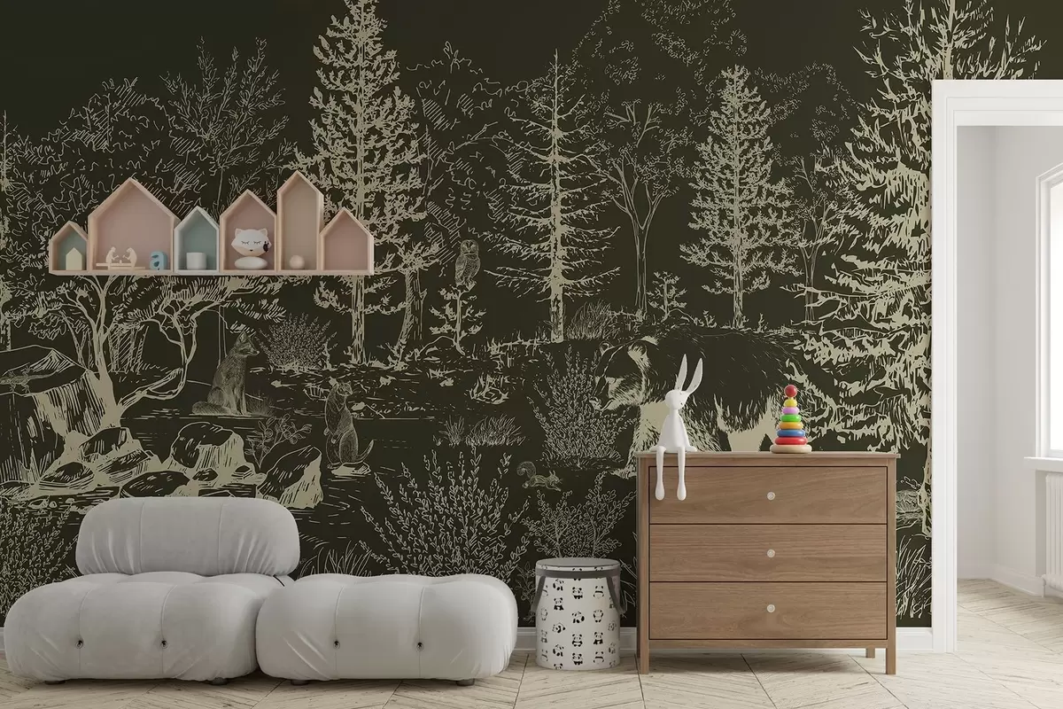Тапете за зид Живот у шуми, дрвеће, дивље животиње, медвед, лисица, сова, жбуње, тамнозелена позадина бр. w02929v3