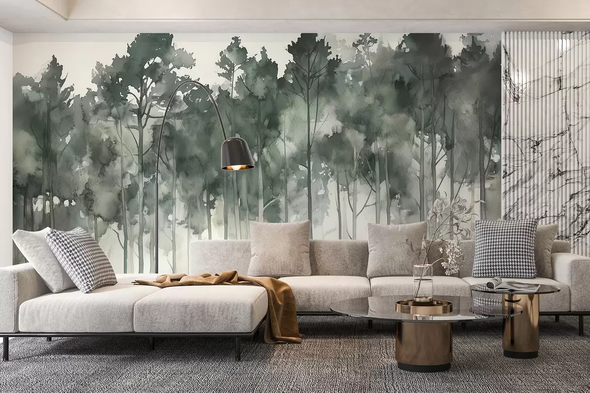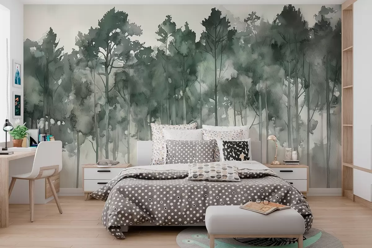 Тапете за зид Шума у стилу акварела, борови, пејзаж природе, зелене боје бр. w02937