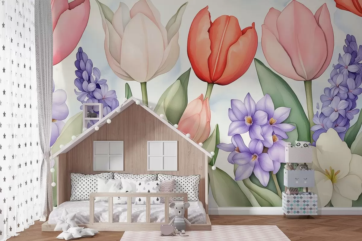 Тапете за зид Пролећно цвеће, лале, зумбул, цртеж у акварелу, цветни бр. w02940