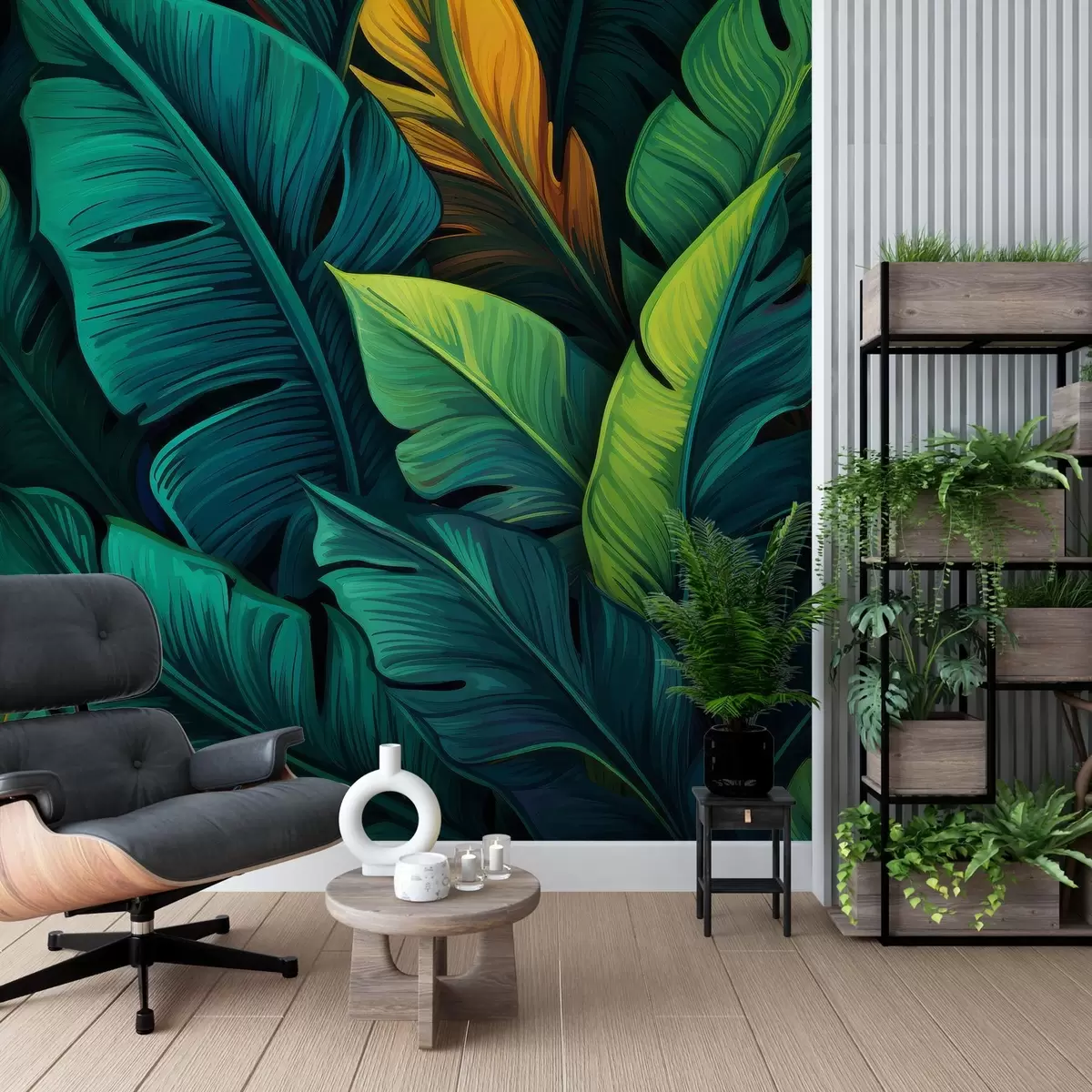 Тапете за зид Живописно тропско лишће са тамнозеленим, плавичастим и наранџастим нијансама бр. w03078