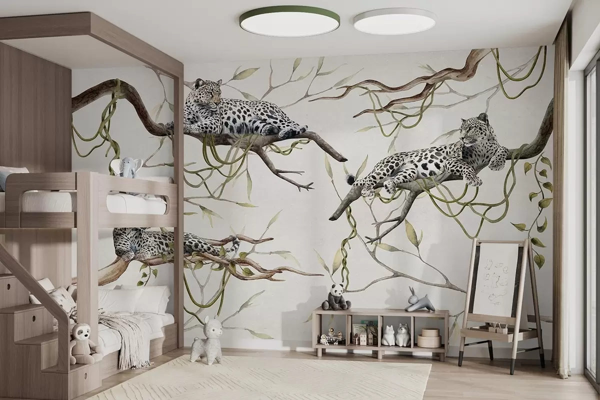 Тапете за зид Леопарди на дрвећу џунгле, лијане, тропске, дивље животиње, пастелна палета боја бр. w03146v4