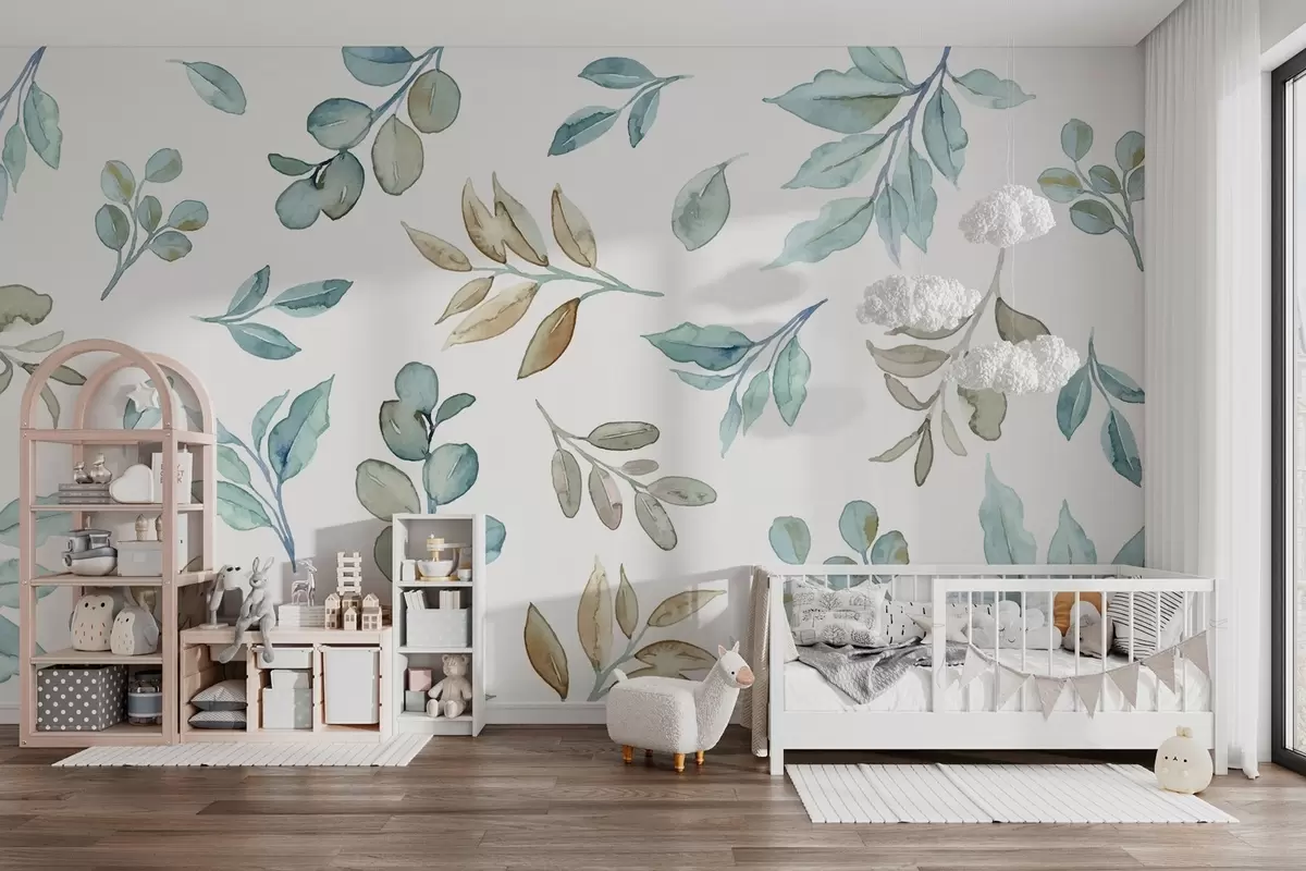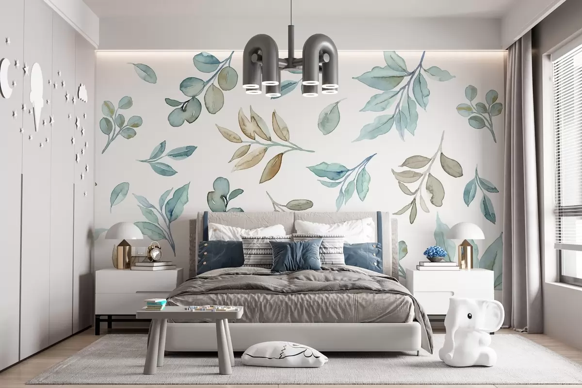 Тапете за зид разно лишће и гране у техници акварела у плавим и беж тоновима на белој позадини бр. w03280