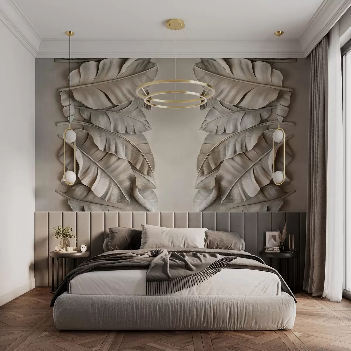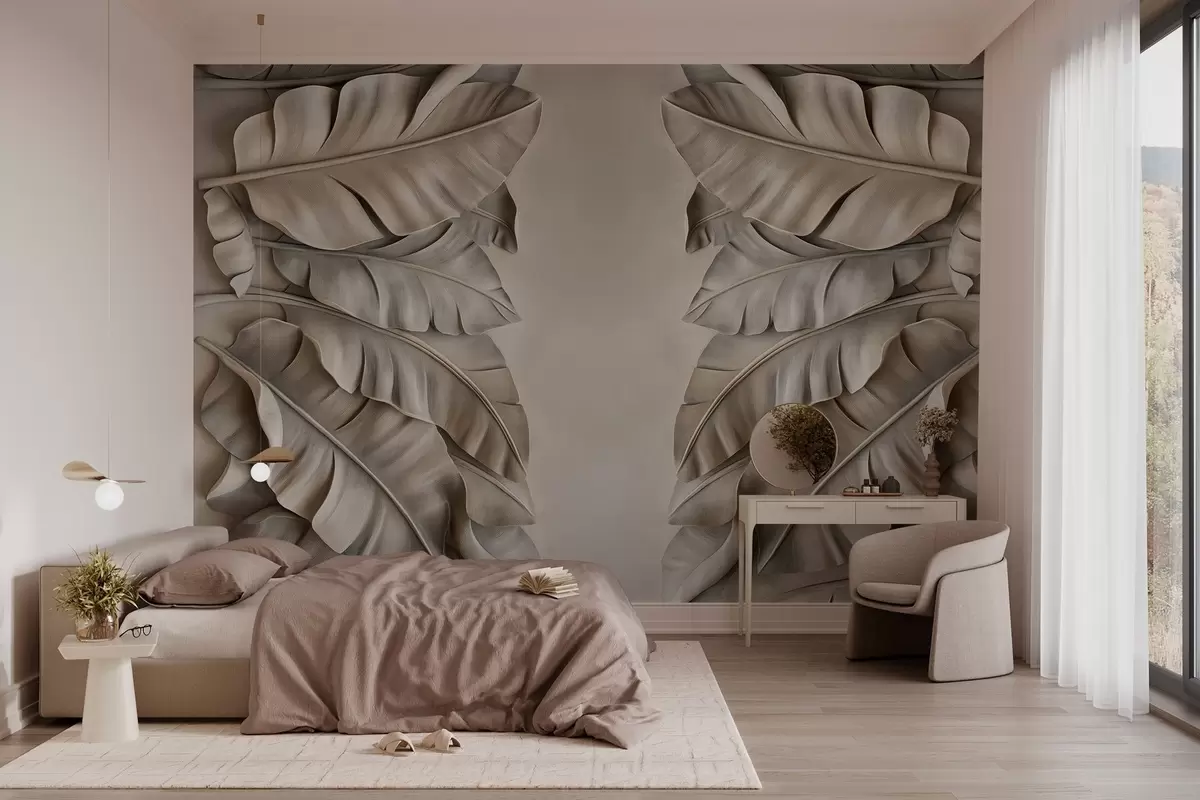 Тапете за зид имитација барељефа са тропским листовима у беж тоновима бр. w03285