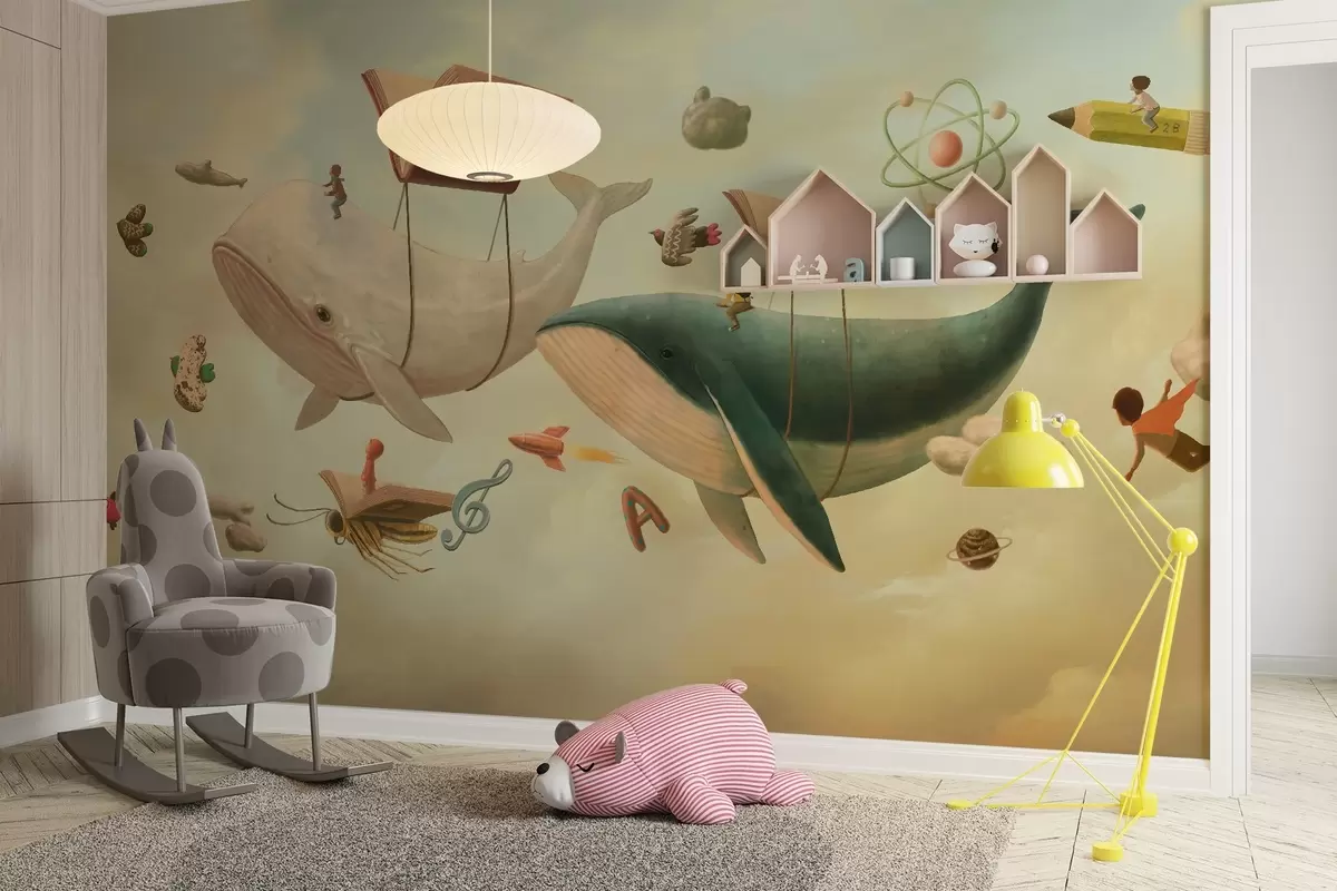 Тапете за зид Необична илустрација китова који лете небом испод балона у облику књиге бр. w03327v1