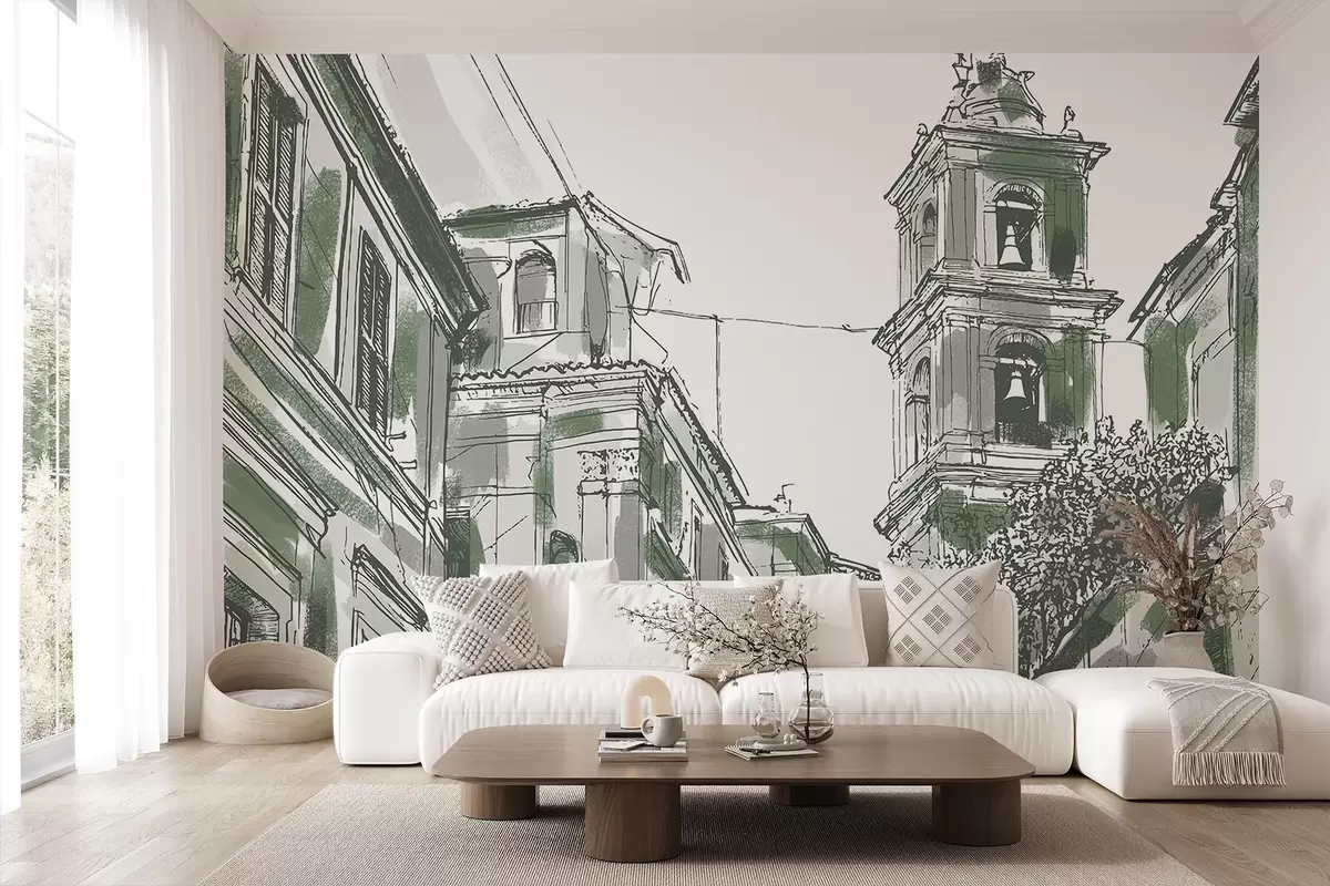 Тапете за зид Медитеранска градска улица, капела, архитектура, сиве и зелене боје бр. w03350v2