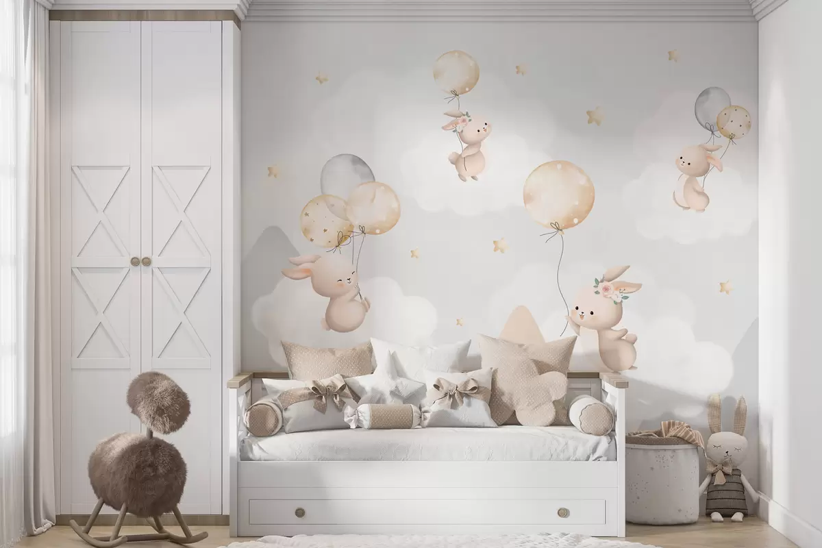 Тапете за зид Зечићи са балонима на облацима међу планинским врховима бр. w03375v1