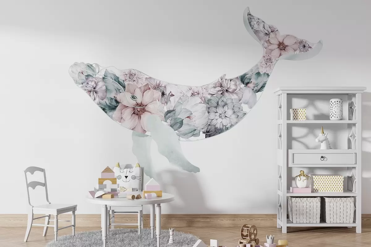 Тапете за зид Предиван кит са акварелним цвећем, морске животиње бр. w03445v1