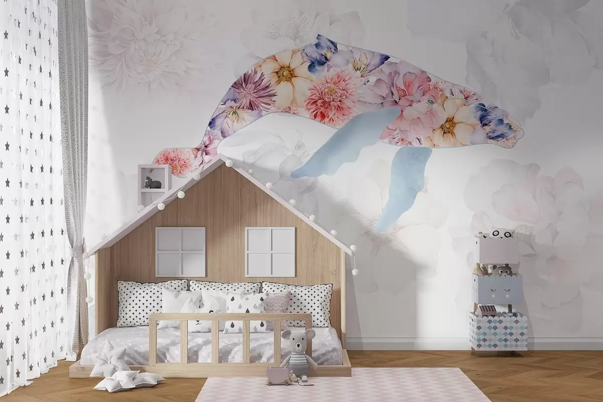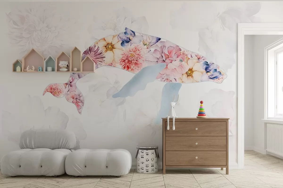Тапете за зид Кит са акварелним цвећем, океанске животиње, минимализам, шарено бр. w03446