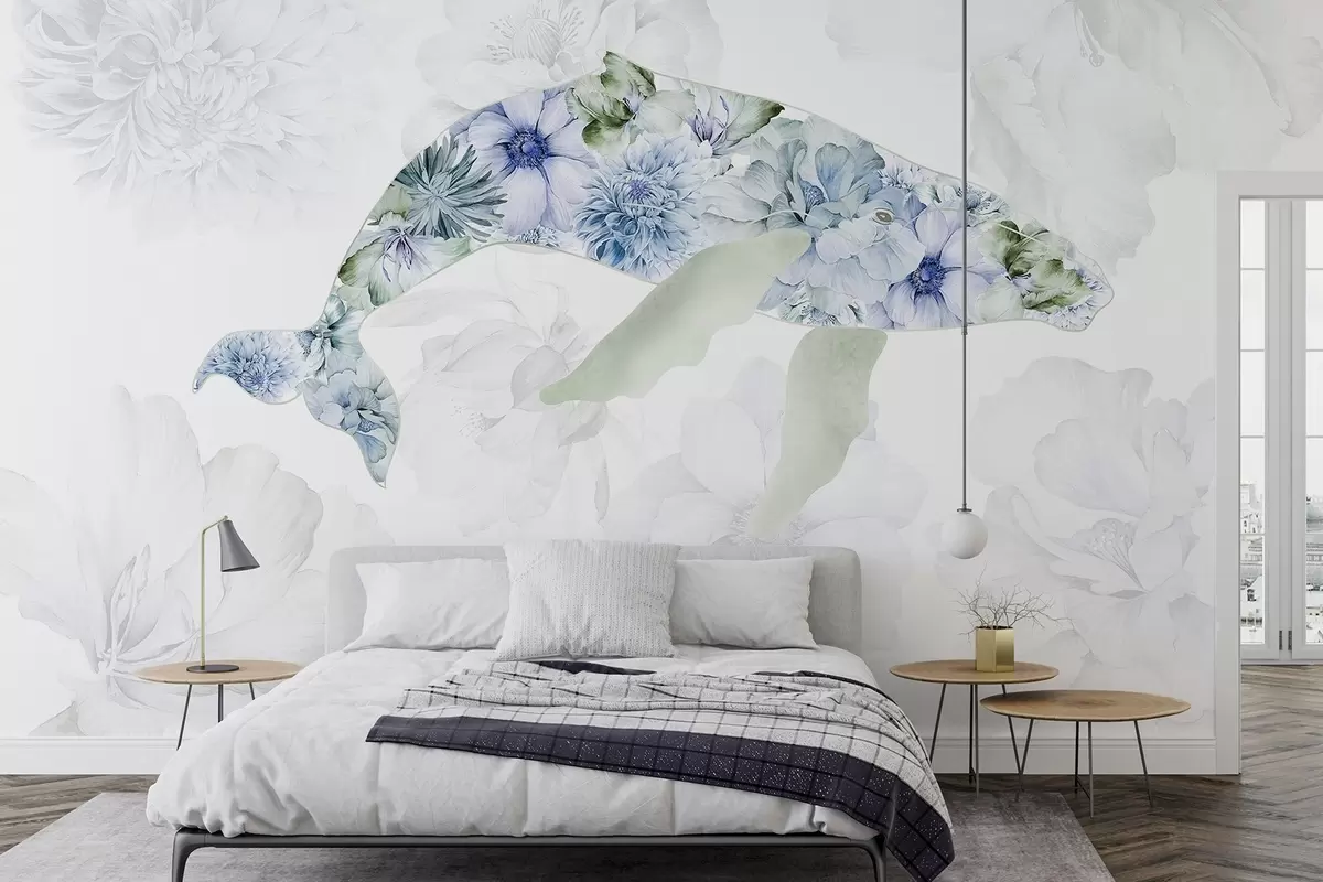 Тапете за зид Кит са акварелом, океанске животиње, минимализам, плава и зелена бр. w03446v2