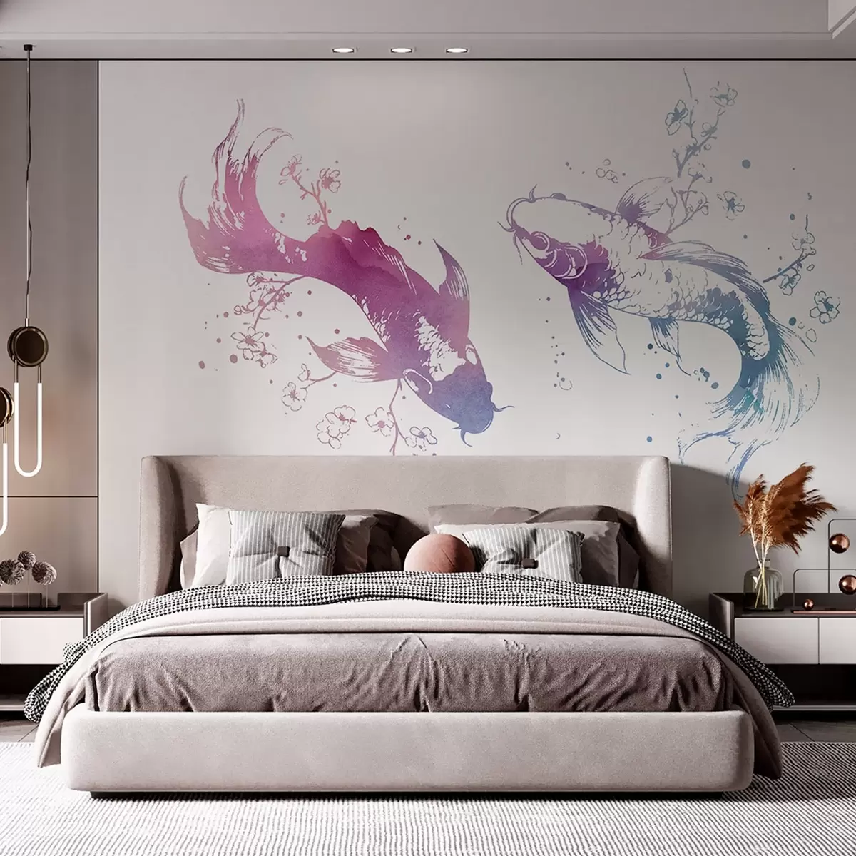 Тапете за зид Акварел риба, оријентални стил, дрво трешње, плава и љубичаста бр. w03447