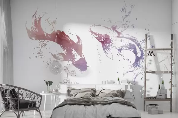 Тапете за зид Акварел риба, оријентални стил, дрво трешње, љубичасте боје бр. w03447v1
