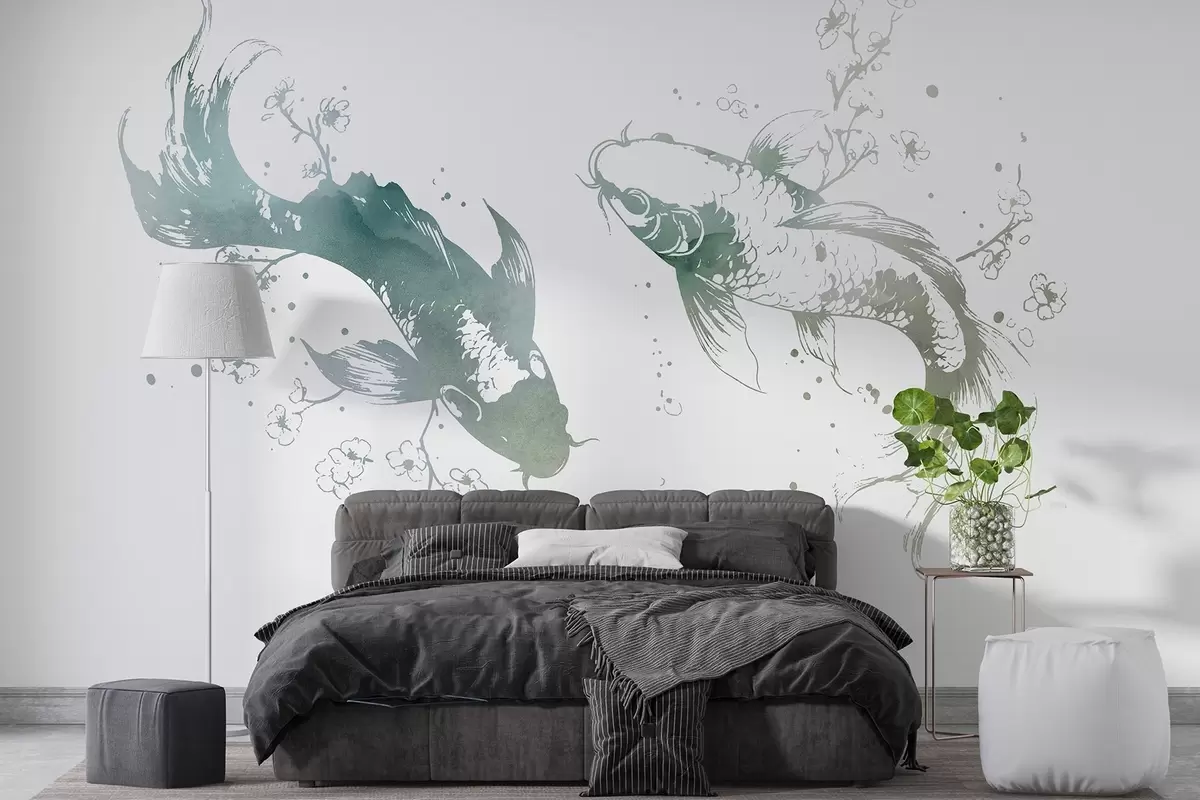 Тапете за зид Акварел риба, оријентални стил, дрво трешње, зелене боје бр. w03447v2