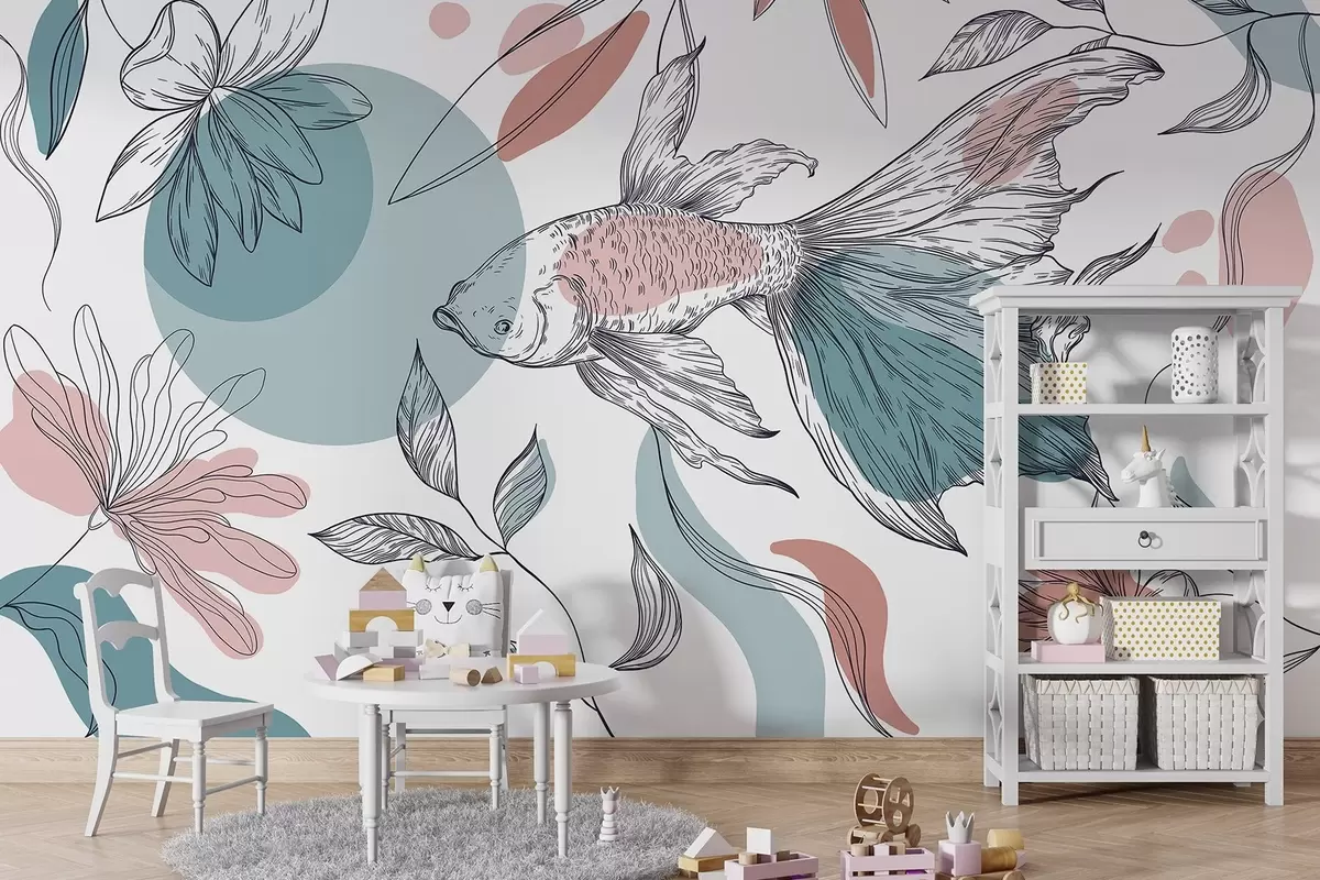 Тапете за зид Цртање рибе са цвећем, минимализам, морски, цветни, плави и розе бр. w03448v1