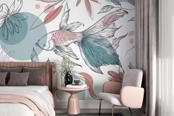 Тапете за зид Цртање рибе са цвећем, минимализам, морски, цветни, плави и розе бр. w03448v1