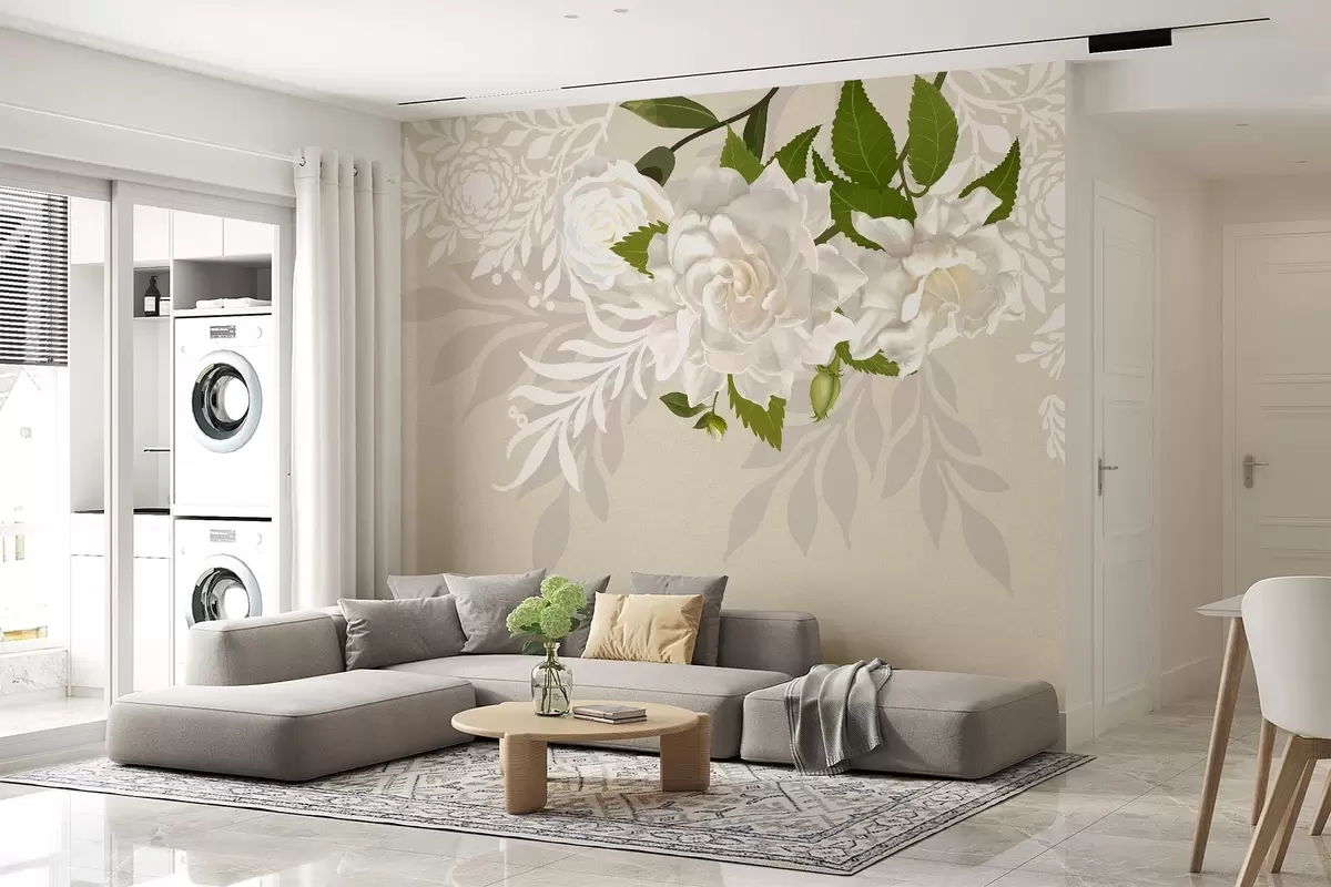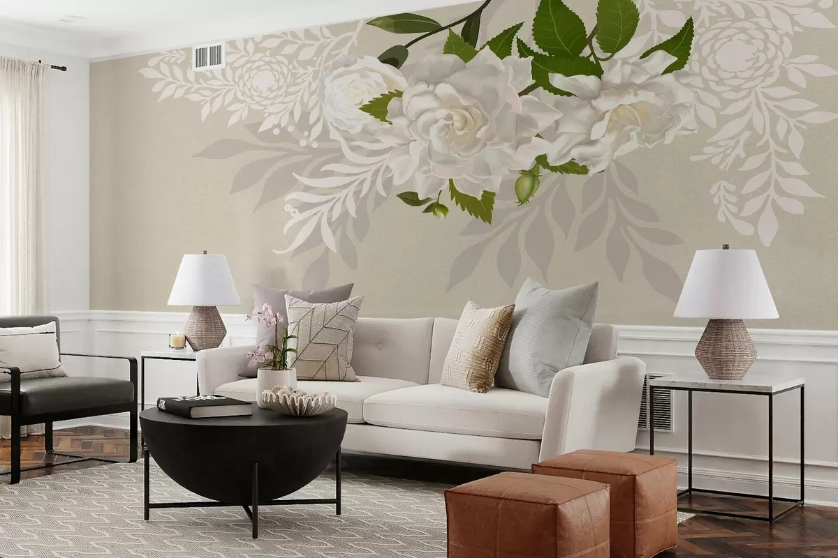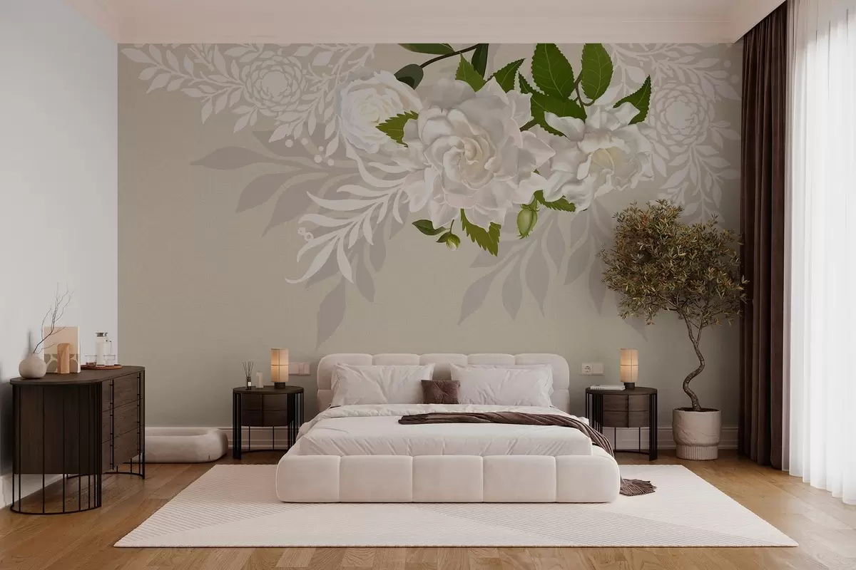 Тапете за зид беле руже на беж шареној позадини бр. w03453