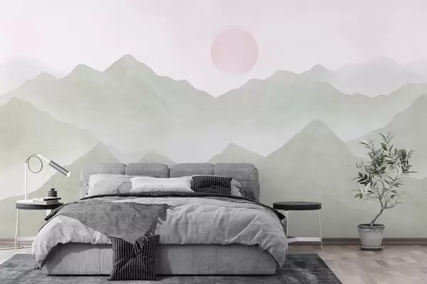 Тапете за зид Бохо стил планине пејзаж, залазак сунца, меки пастел, зелена бр. w03547