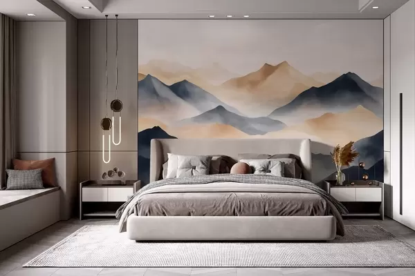 Тапете за зид Планински пејзажи, акварел стил, магла, беж и сива бр. w03548