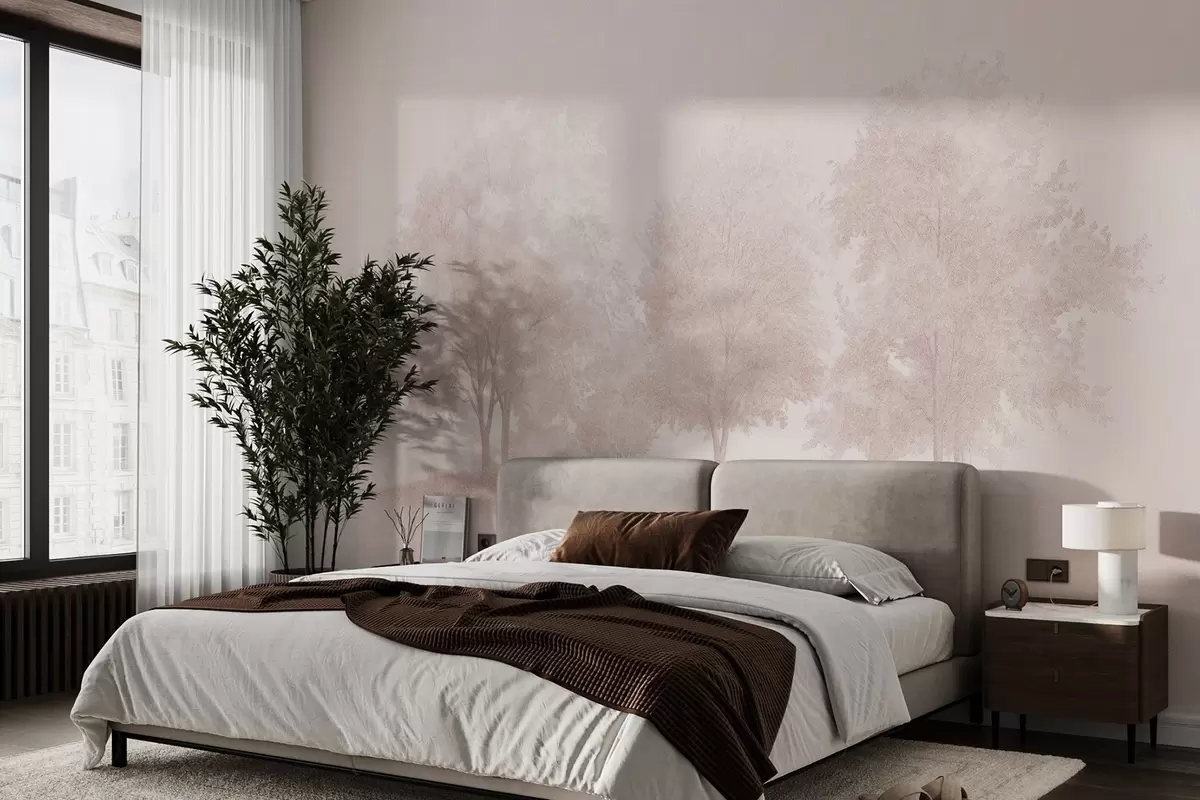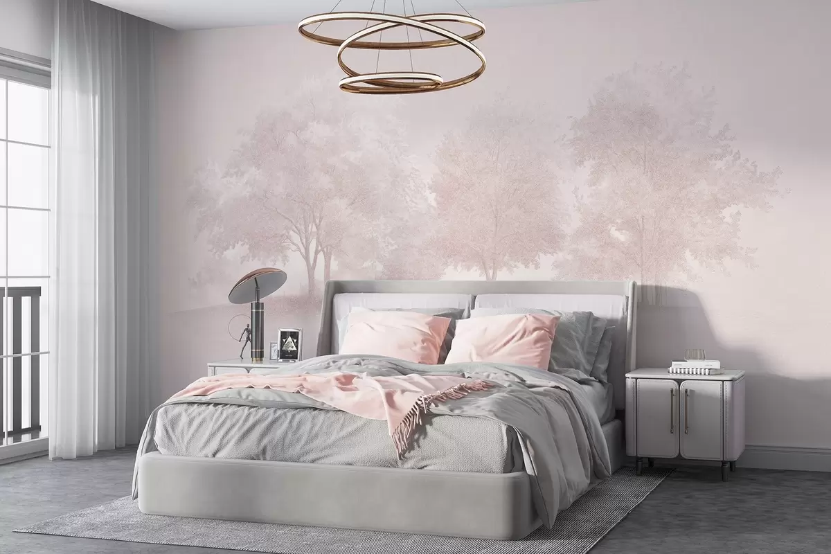 Тапете за зид Цветно дрвеће, пролеће, цртеж у стилу оловке, розе боје, природа бр. w03549