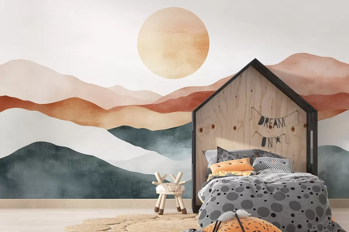 Тапете за зид Акварел планине са сунцем, бохо стил, црвена, наранџаста, сива бр. w03551