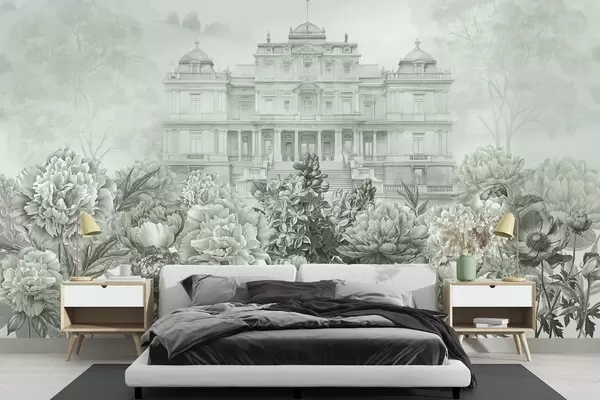 Тапете за зид Краљевска палата са вртом божура, стил акварела, природа, зелене боје, бохо бр. w03552v2