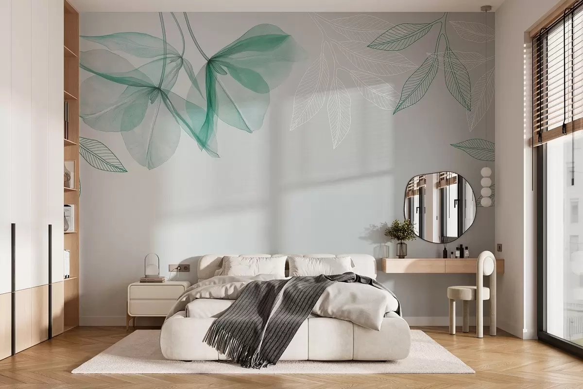 Тапете за зид нежни провидни цветови и листови у зеленим тоновима бр. w03616v1