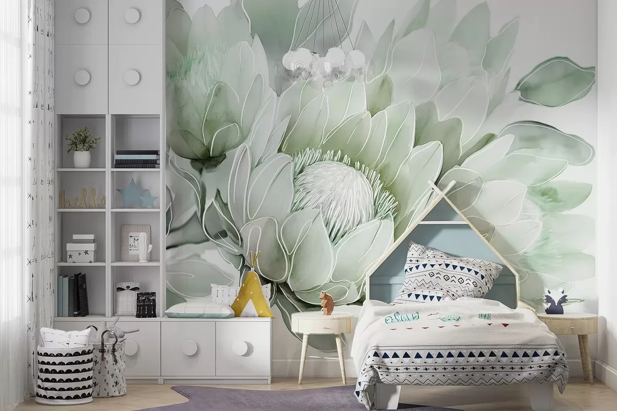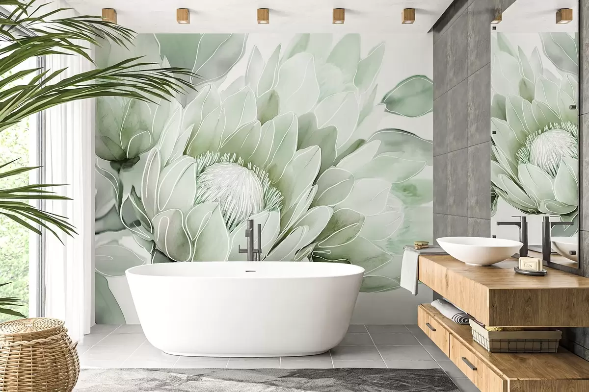 Тапете за зид Прелепо цвеће протеа, уметнички цртеж, тропске, зелене боје бр. w03669v2