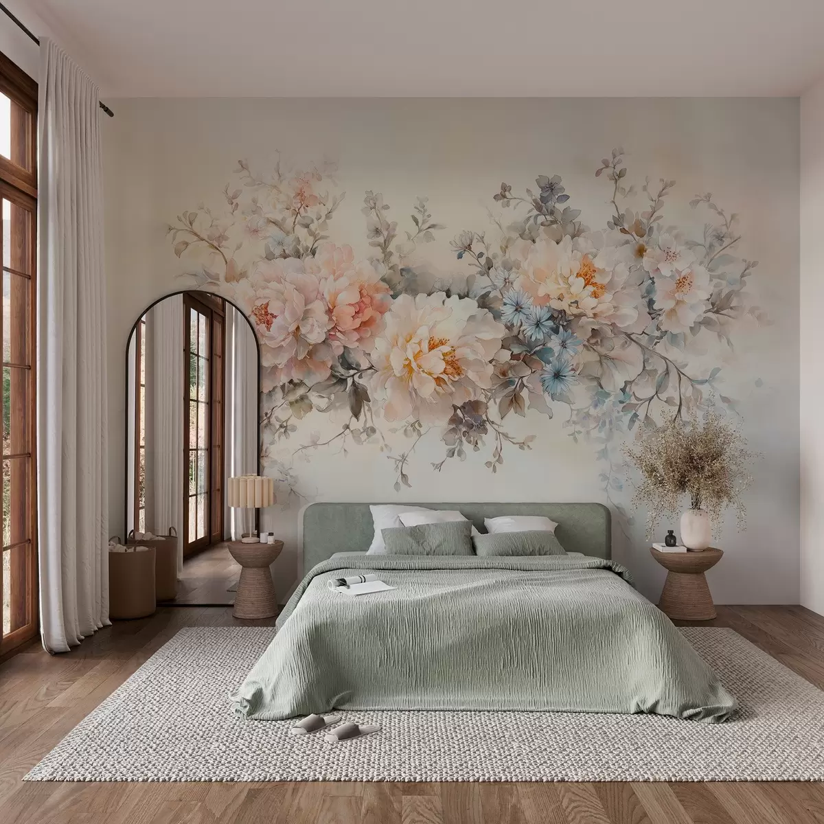 Тапете за зид нежно цвеће у стилу акварела у пастелним нијансама розе, беж и плаве бр. w03724
