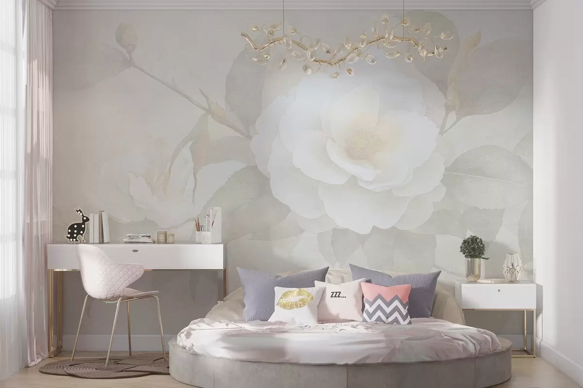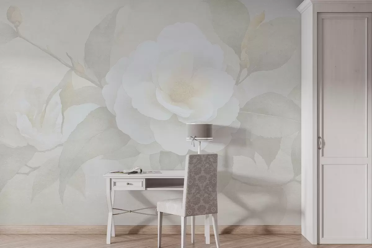 Тапете за зид Меки пастел са цветовима камелије на грани, беж боје бр. w03760