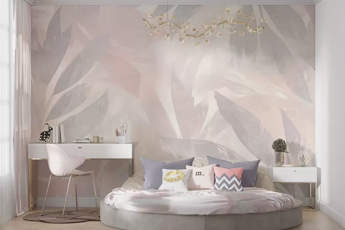 Тапете за зид Тропско лишће, цвеће, палме, пастелни стил, розе и беж боје бр. w03881