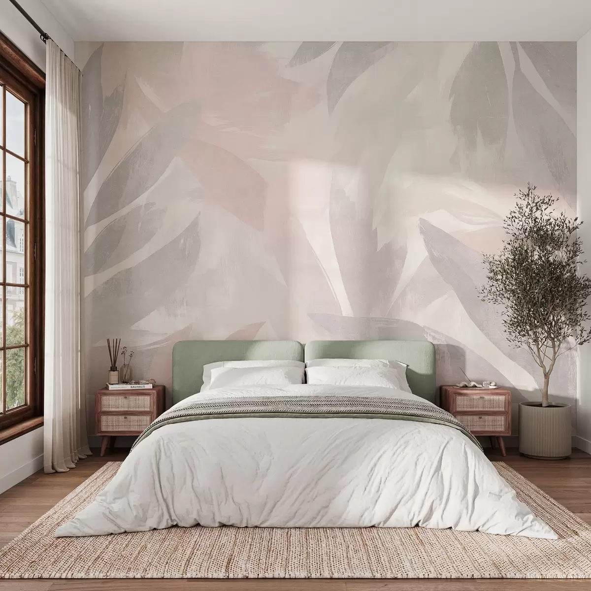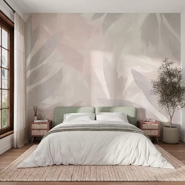 Тапете за зид Тропско лишће, цвеће, палме, пастелни стил, розе и беж боје бр. w03881