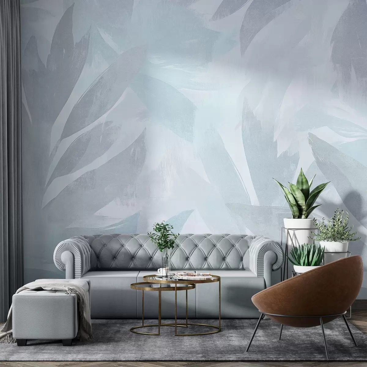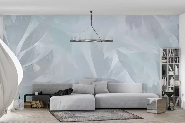 Тапете за зид Тропско лишће, цвеће, палме, пастелни стил, плаве боје бр. w03881v2
