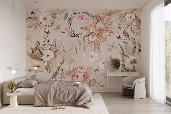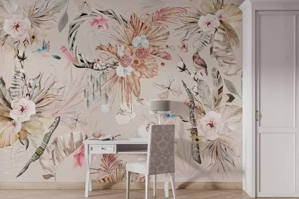 Тапете за зид Орнамент у бохо стилу са цветовима и птицама божура, акварел стил, нежне боје бр. w03885v3