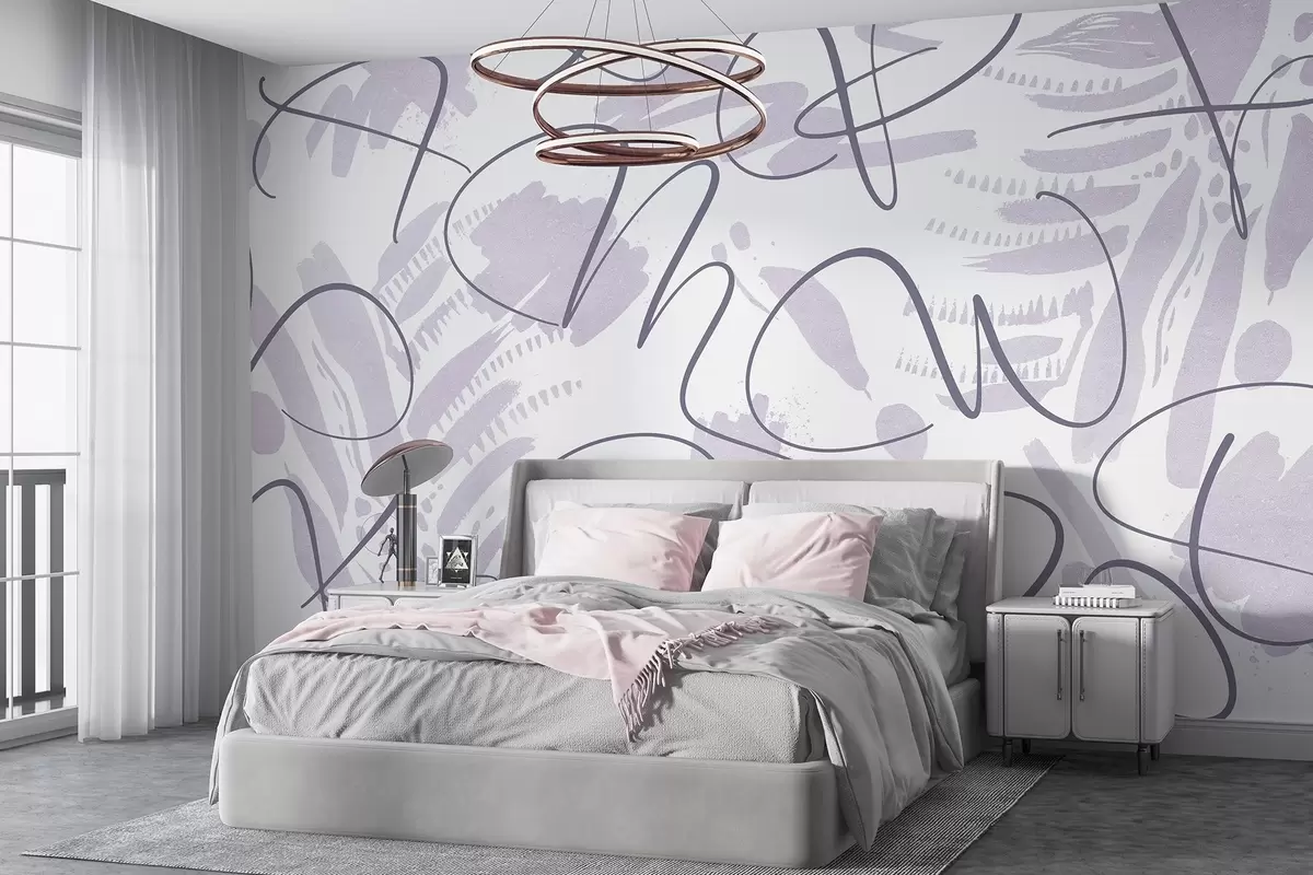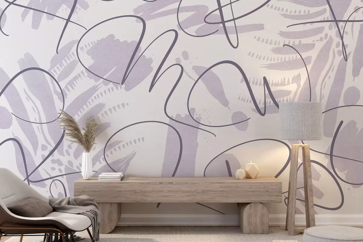 Тапете за зид Калиграфска апстракција са словима, потези четкице, љубичаста боја бр. w03913v2