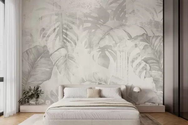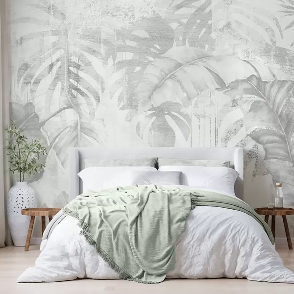 Тапете за зид Тропско лишће у гранџ стилу, монохроматске нијансе бр. w03956v1