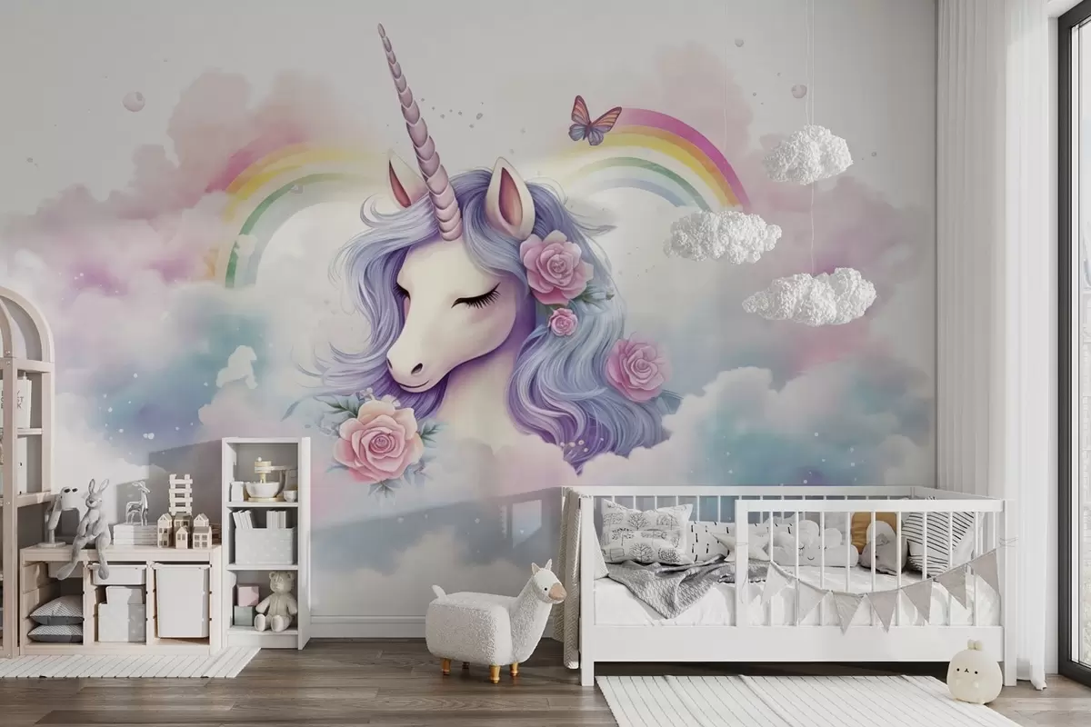 Тапете за зид Пастелни једнорог у облацима са дугом и ружама бр. w03990