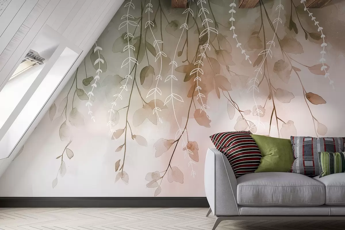 Тапете за зид Гране са лишћем у акварел стилу, природне јесење боје бр. w04007v1