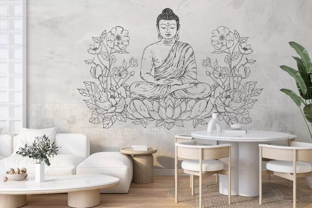 Тапете за зид Медитирајућег Буде са цветовима лотоса, линијске уметности, оријенталне, беж позадине бр. w04008v1