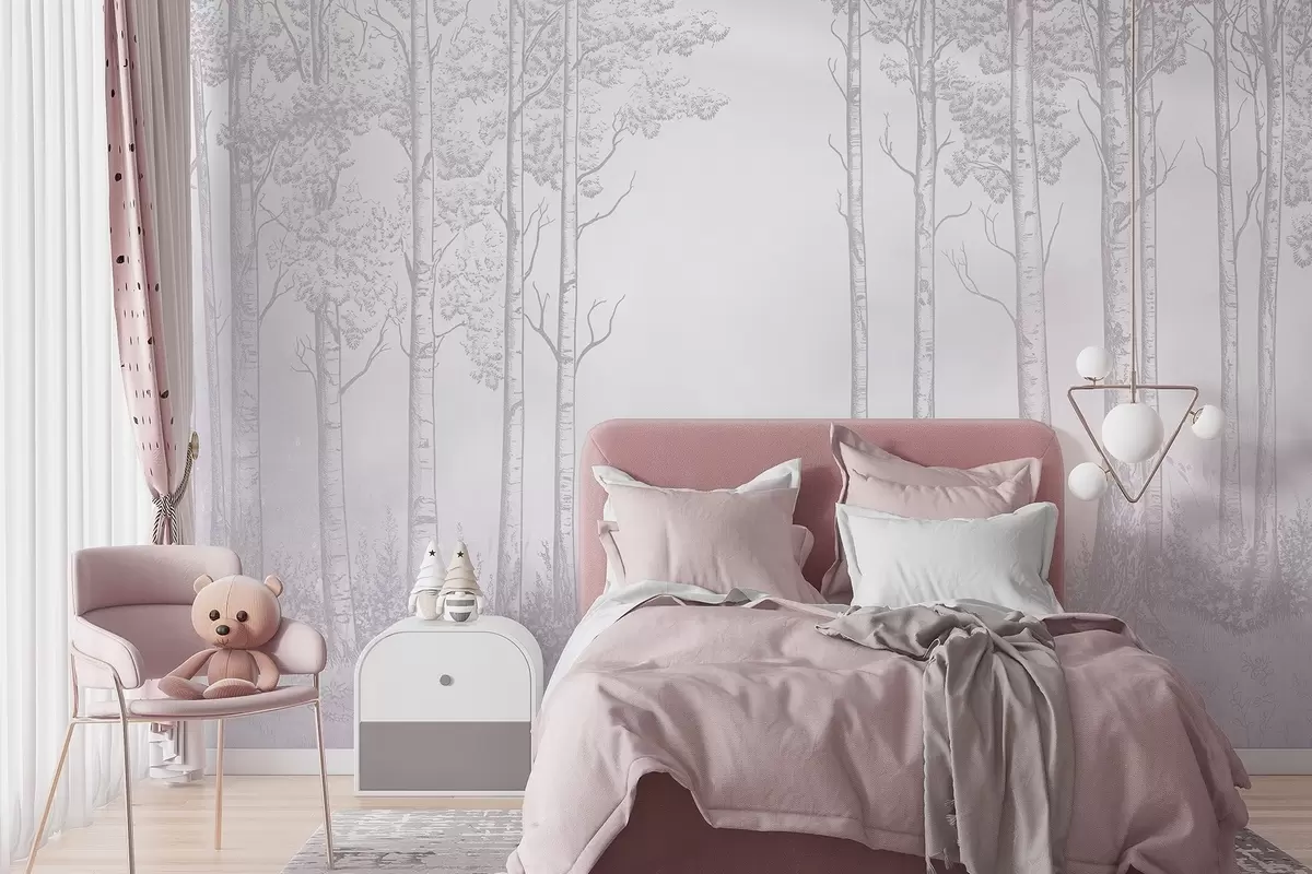 Тапете за зид Шума са брезама, минимализам, природа, ружичаста палета боја бр. w04009v2