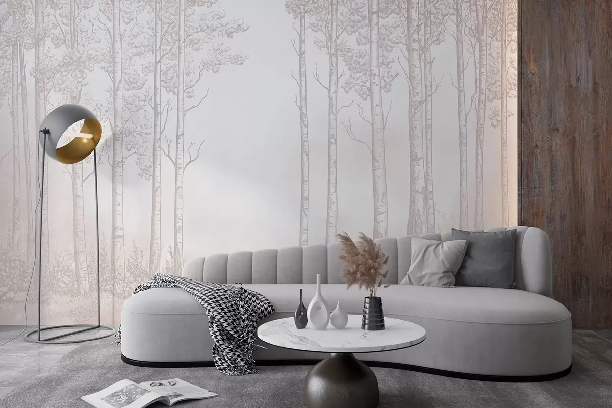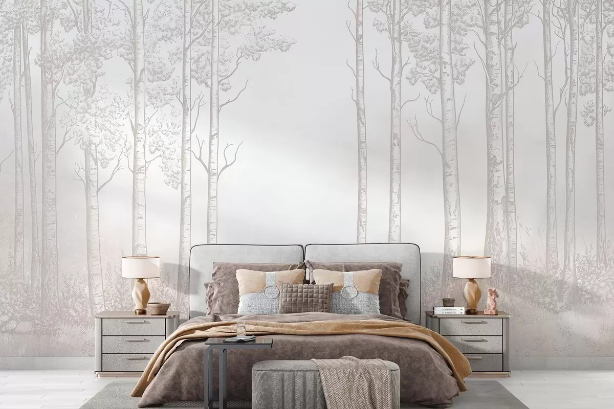 Тапете за зид Шума са брезама, минимализам, природа, беж палета боја бр. w04009v3