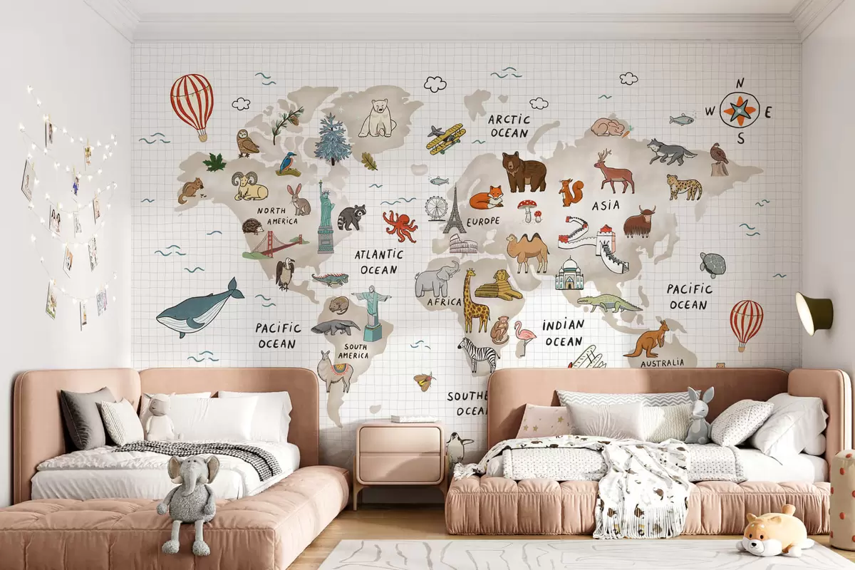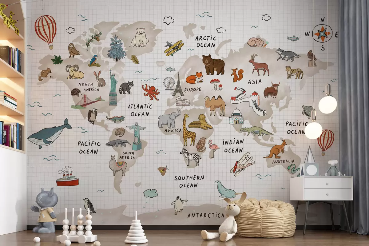 Тапете за зид Мапа света са животињама и знаменитостима бр. w04011