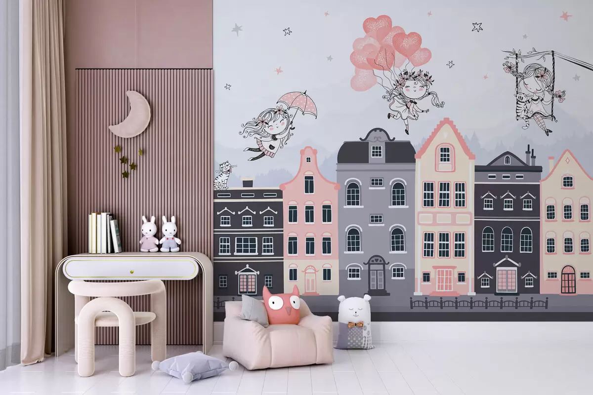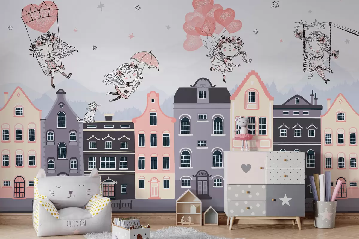 Тапете за зид Градски пејзаж са слатким девојкама бр. w04014