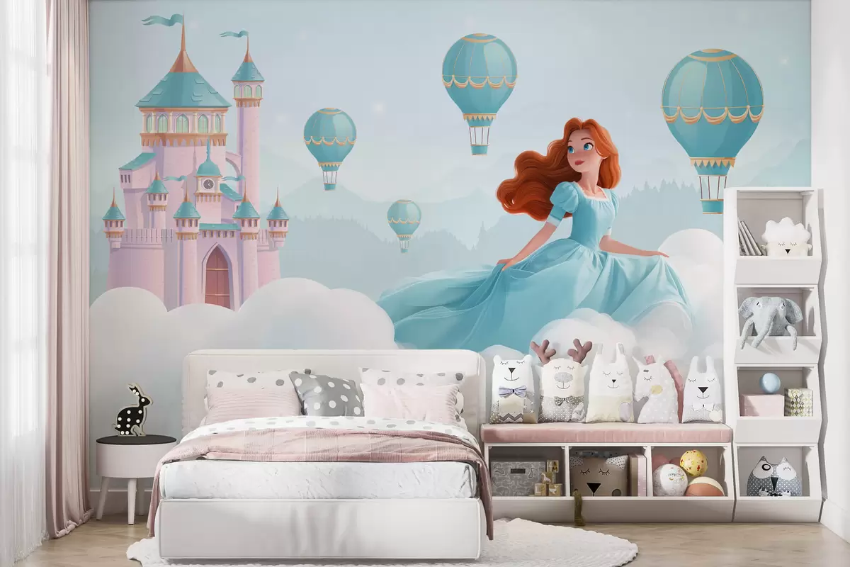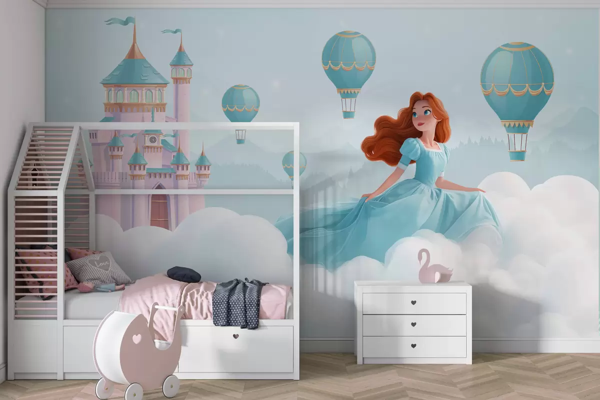 Тапете за зид Принцеза међу облацима на позадини пејзажа са замком бр. w04015