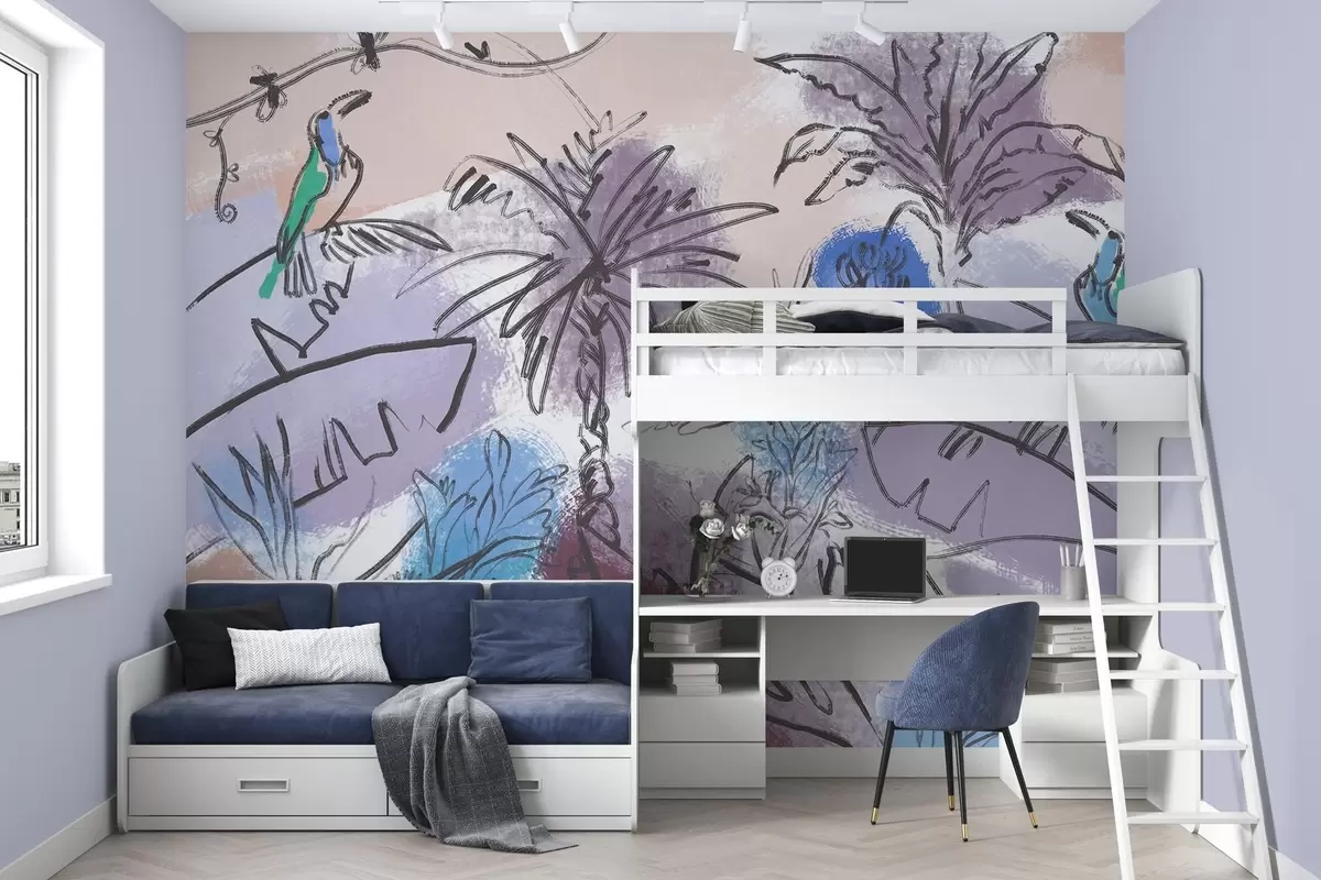 Тапете за зид Тропски принт са плавим цвећем, сликовити папагаји бр. w04019v2