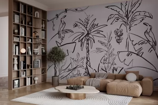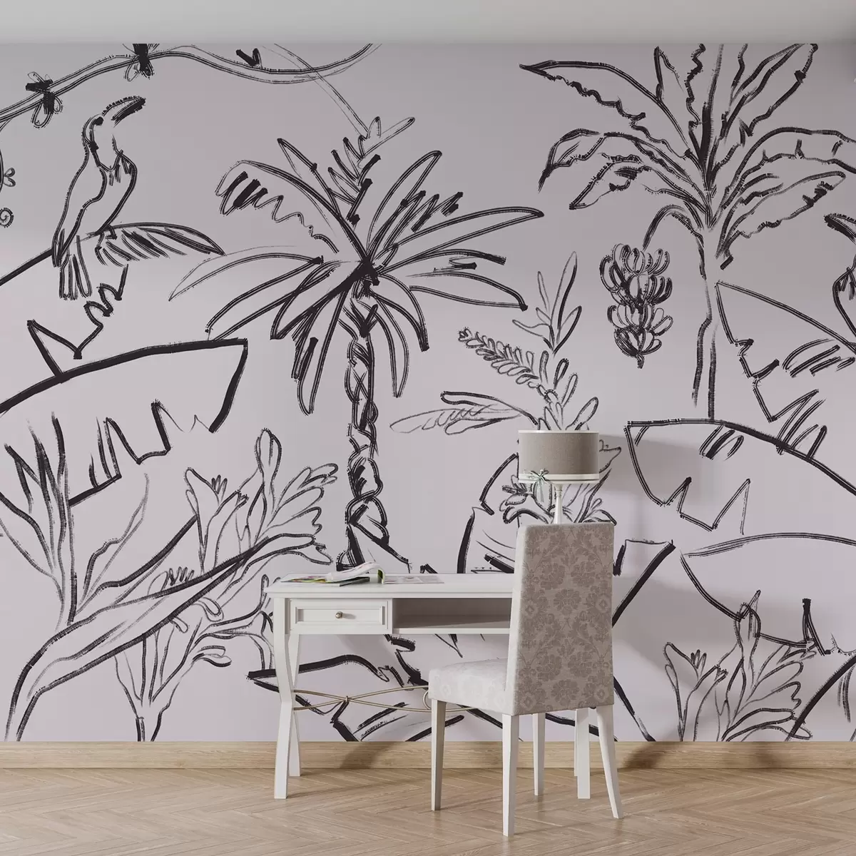 Тапете за зид Тропски узорак у црној боји, палме, банане, контурна графика бр. w04020v7