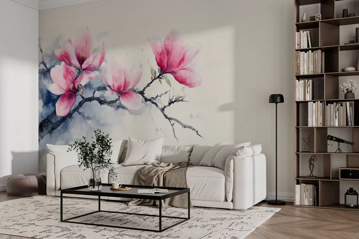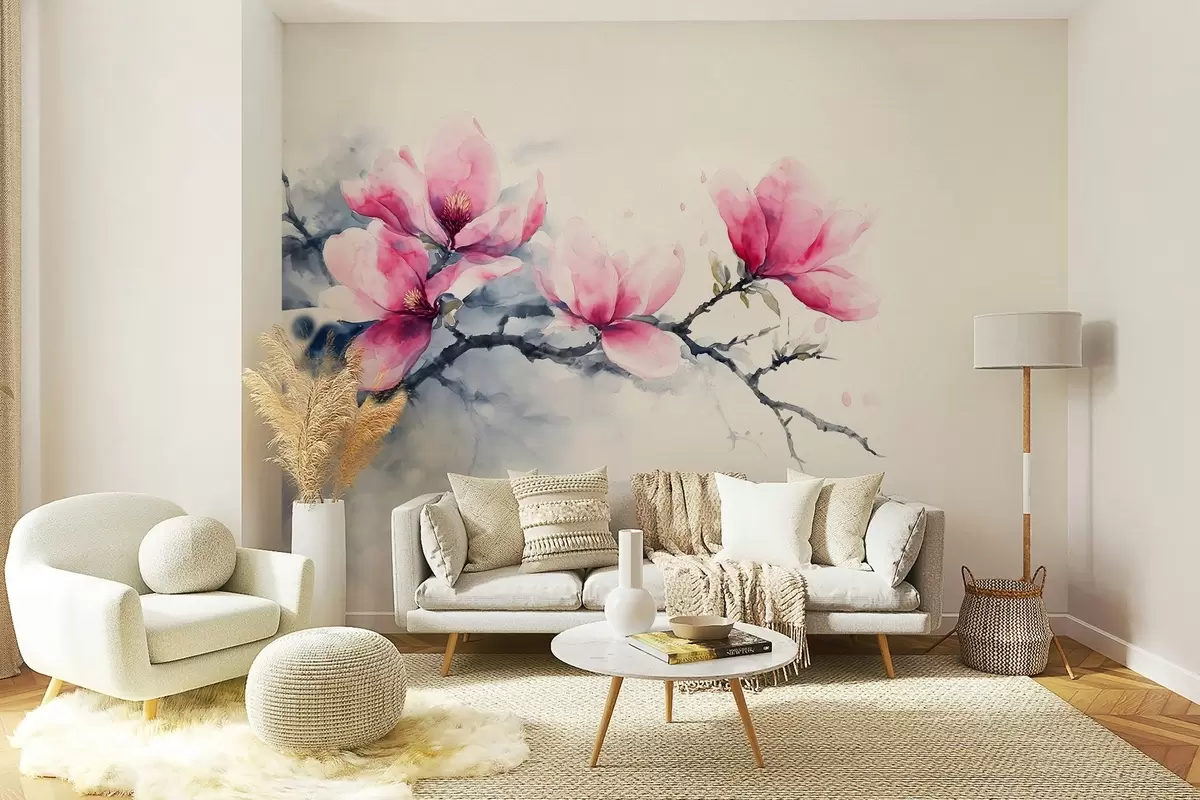 Тапете за зид Цветајућа грана ружичасте магнолије на позадини боје слоноваче бр. w04027