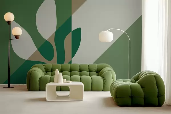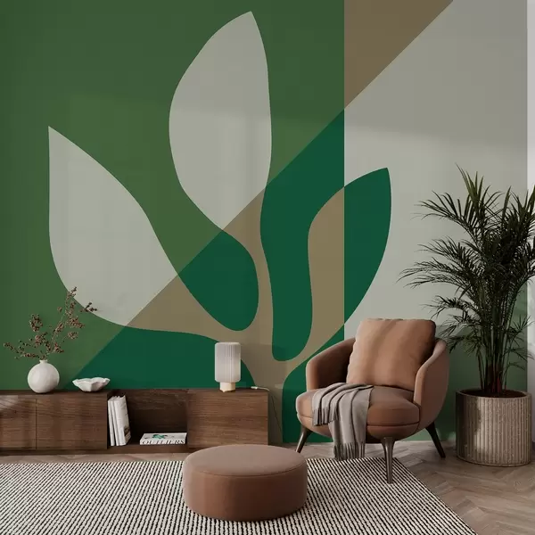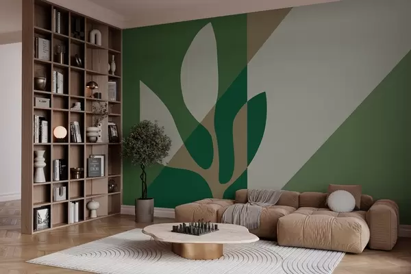 Тапете за зид апстрактна графичка биљка на позадини геометрије у зеленим и окер бојама бр. w04028
