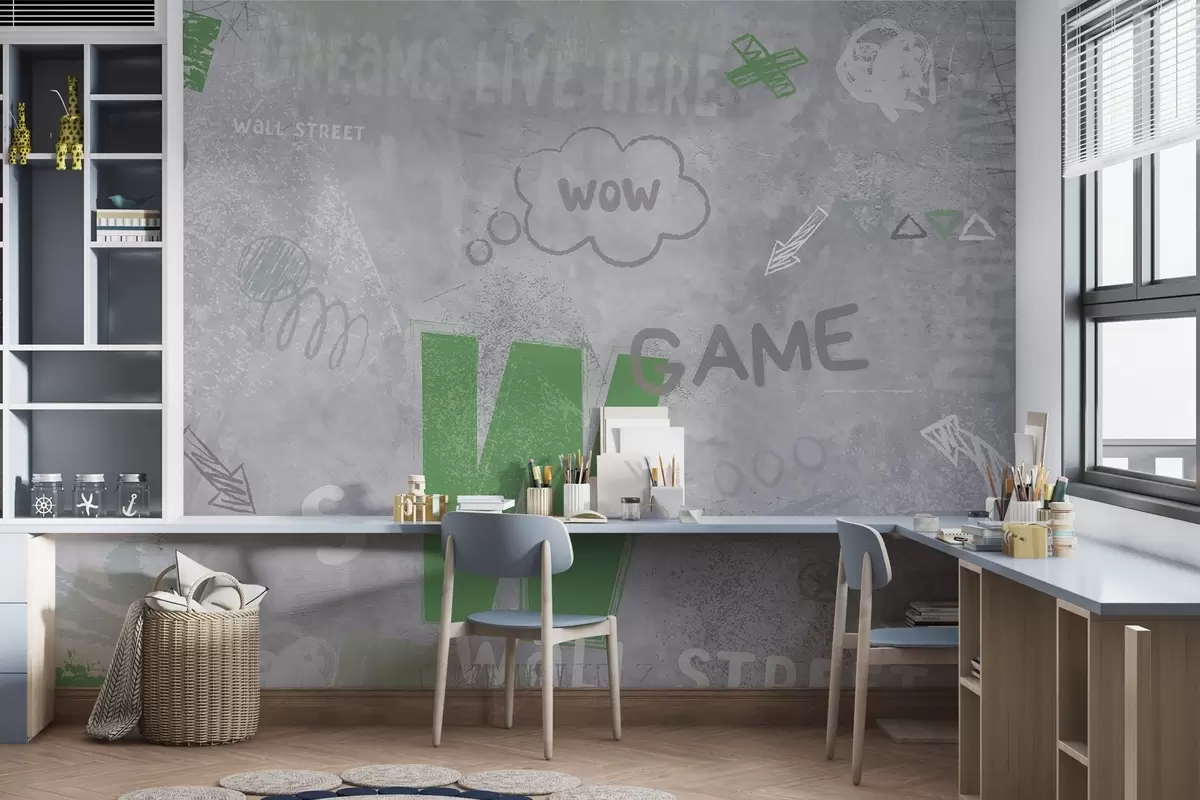Тапете за зид Дизајн уличне уметности са зеленим словима на позадини бетонског зида бр. w04056v2